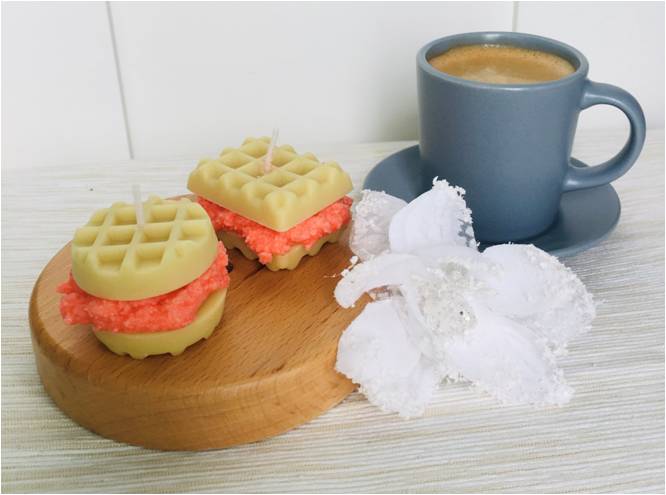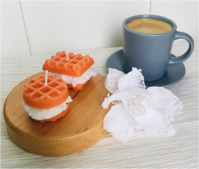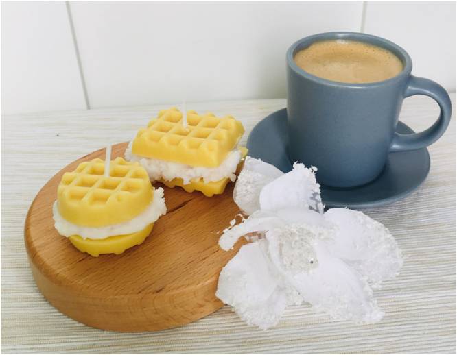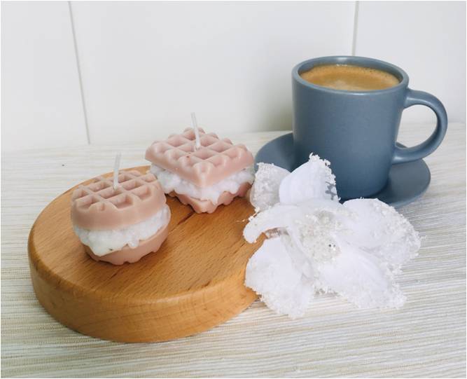 Balení obsahuje 2ks - kulatou a obdélníkovou svíčku ve tvaru vafle